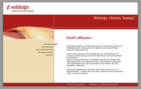| Durch eine neue berufliche Perspektive des Geschäftsinhabers, hat gl webdesign - Agentur für Neue Medien - nach über fünfjähriger Tätigkeit die geschäftlichen Aktivitäten zum 30. April 2006 eingestellt.